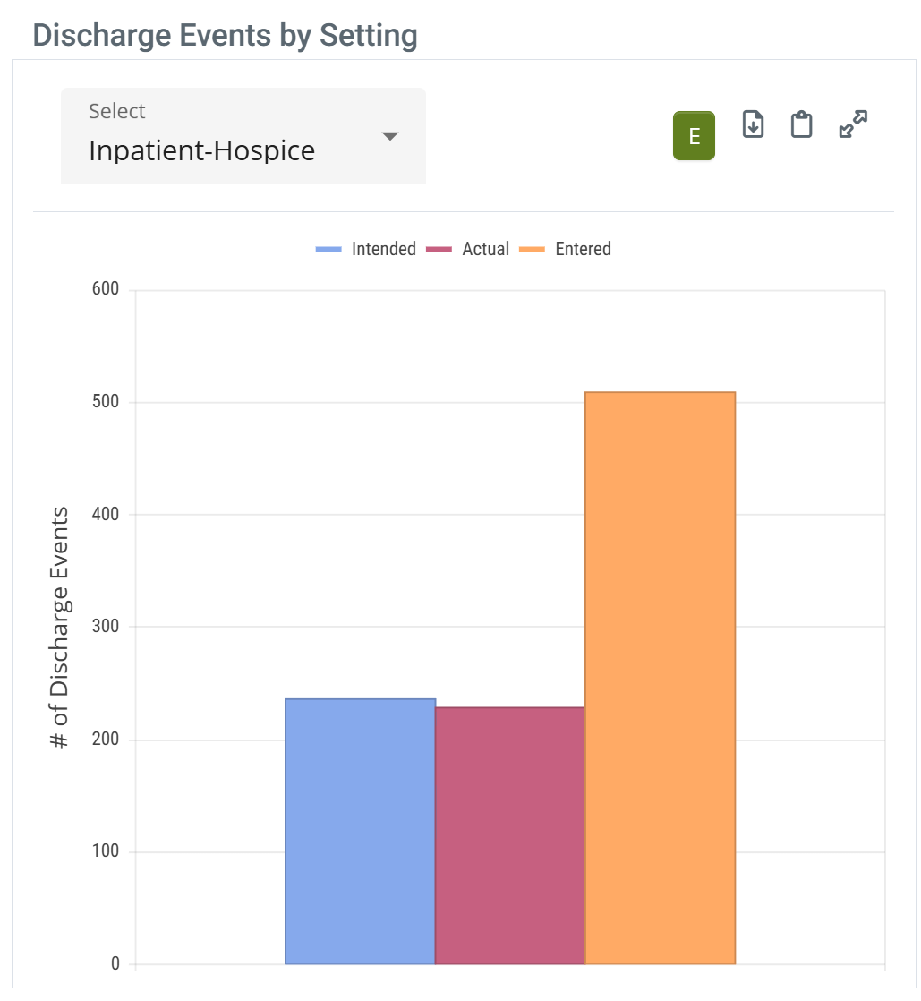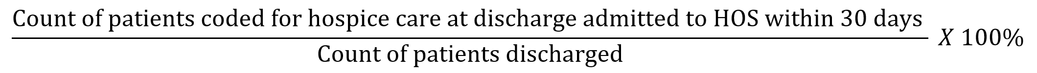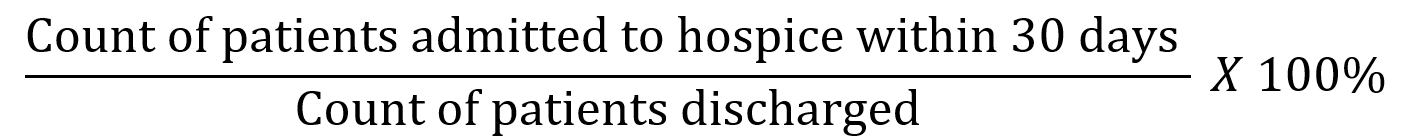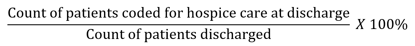 As implied, this metric identifies the percentage of patients who were coded for hospice care at discharge, indicating that the intention was for the patient to seek hospice care after discharge. The percentage includes both patients who were admitted to hospice care and those who weren't admitted to hospice. Patients who weren't admitted to home care might have been admitted to other post-acute care.