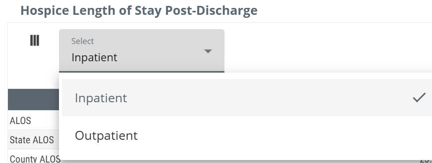 The dropdown selector at the top-left of the table allows you to switch between inpatient and outpatient claims for patients discharged from the selected facility. The table will show length of stay counts that reflect your choice.