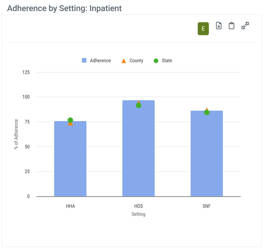 | Adherence by Setting - Only shows with Chart View on - chart shows the adherence percentages for discharges from the selected facility for patients coded for home health, hospice, and skilled nursing | ![]() |