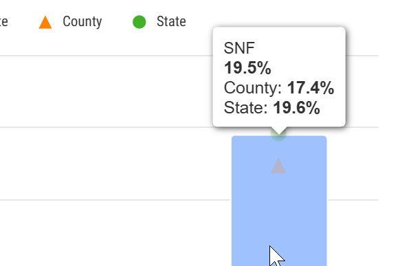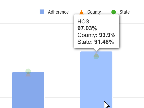 This chart shows the adherence percentages for discharges from the selected facility for patients coded for home health, hospice, and skilled nursing. The stage and county averages for each care type is shown as a triangle and circle.