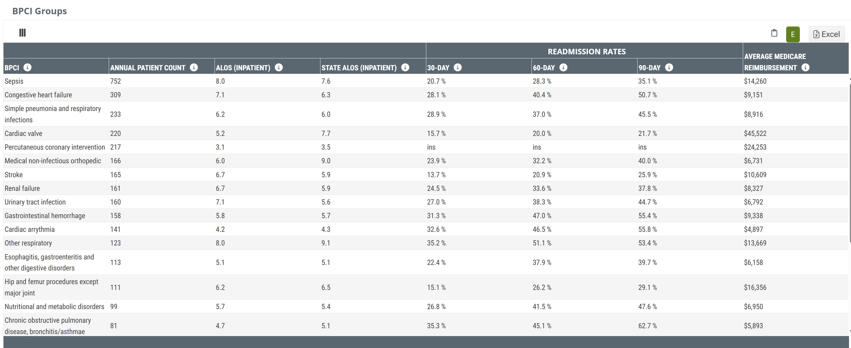 - Readmission Rates - the readmission rate for patients discharged during the two-year reporting period with a diagnosis that aligned with the listed BPCI category who were readmitted to inpatient care within 30, 60, and 90 days of the initial discharge