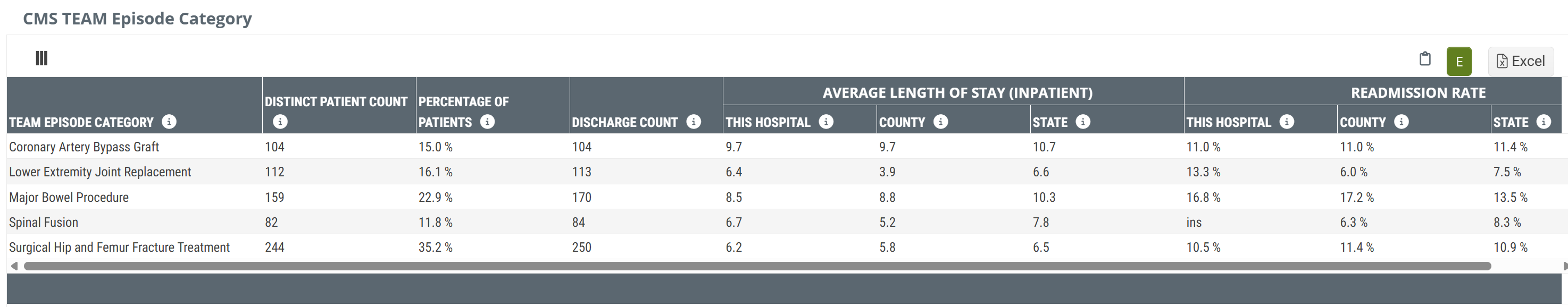 The CMS TEAM Episode Category table provides metrics for the selected facility with a focus on the five TEAM episode categories. At a glance, you will be able to determine the volume of patients treated by the selected facility for each of the five TEAM episode categories along with length of stay metrics and readmission rates.