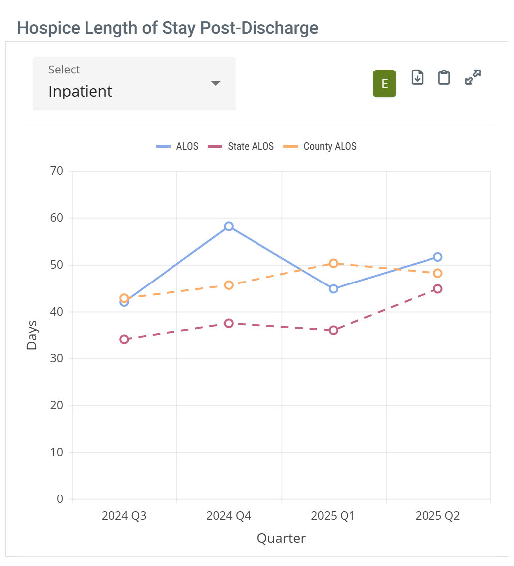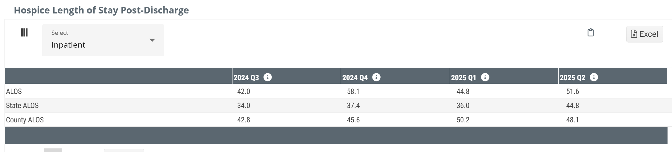 | Hospice Length of Stay Post Discharge - trended length of stay metrics over the last four quarters of data for the selected facility | ![]() |