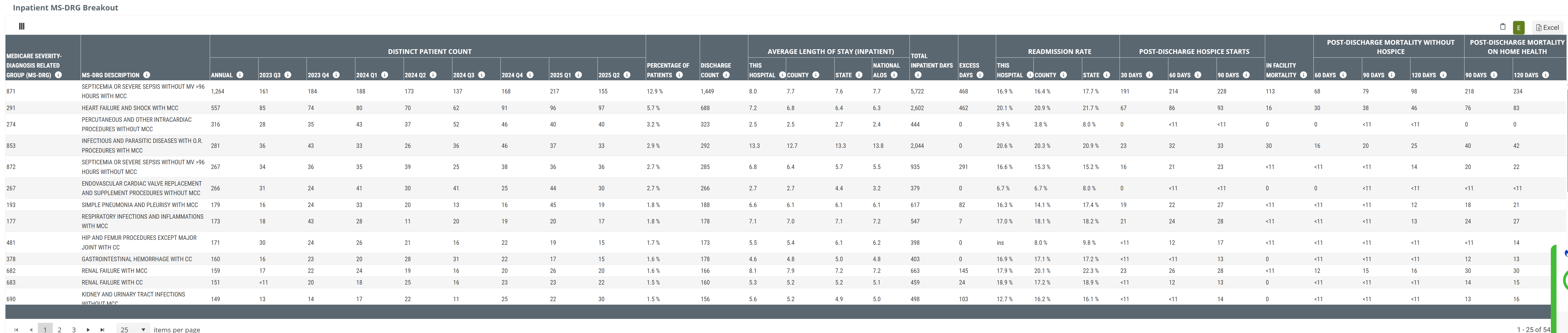 This table contains counts and percentage of patients discharged from the selected facility broken out by Diagnostic Related Group (DRG). For each DRG we have included patient metrics, length of stay metrics, and readmission rates.