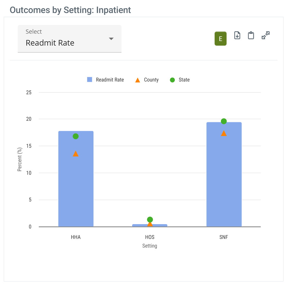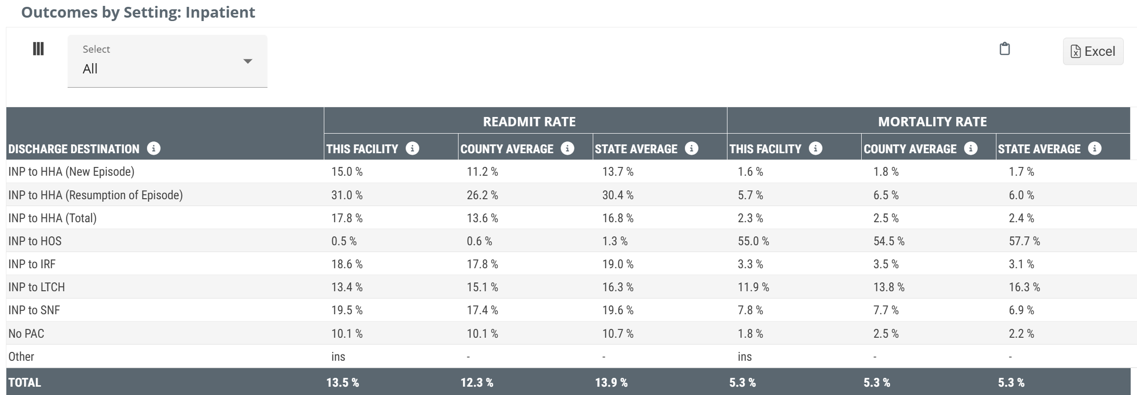 | Outcomes by Setting: Inpatient - provides insights into the post-acute care provided to patients discharged from the selected facility - mortalities and readmission rates | ![]() |