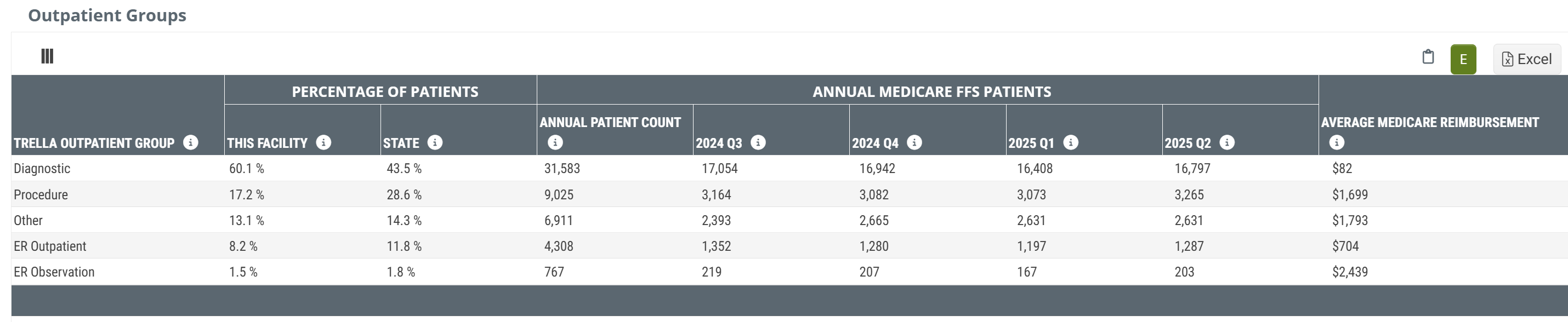 - Trella Outpatient Group - this row header identifies the Trella Outpatient Group assigned to the procedure (HCPCS) code listed on the outpatient claim. The metrics in the row align with the listed Outpatient Group.