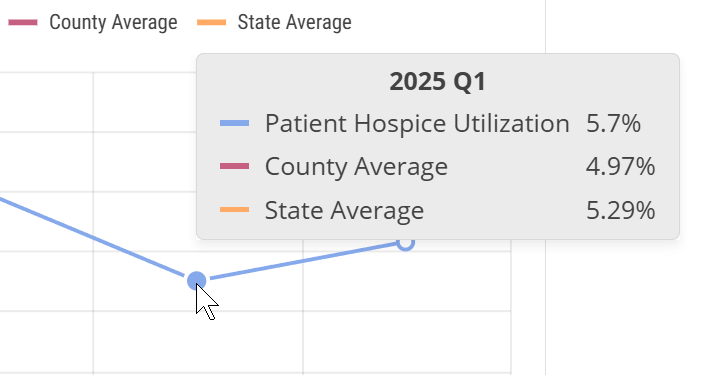 When you hover over a column in the Patient Hospice Utilization chart, the metrics for the data points for the trendlines are displayed. (image below) |