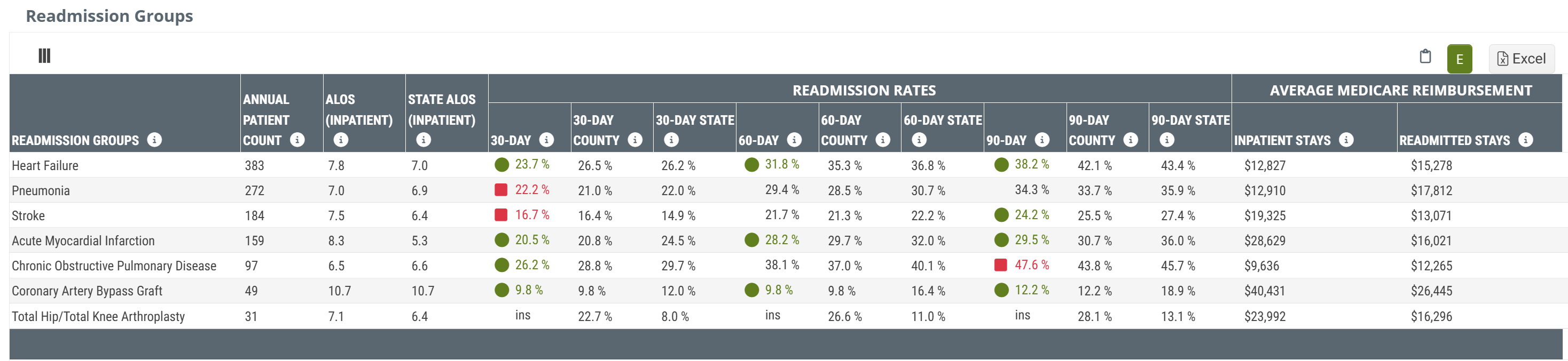 - Readmission Groups - this column shows the readmission group for each row. Metrics in the same row are calculated from claims where the primary diagnosis aligns with the listed readmission group