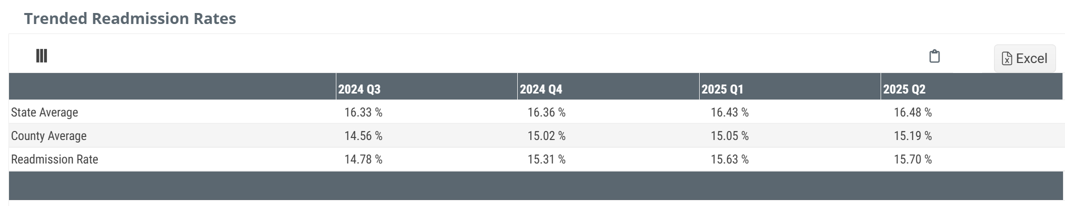 This table includes a trend of readmission rates over the most recent four quarters. The state and county comparison metrics cover all similar facilities in the stated area for the same period.