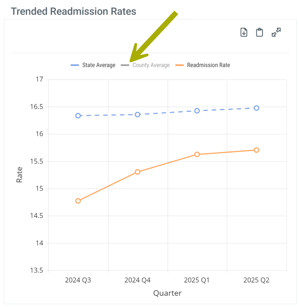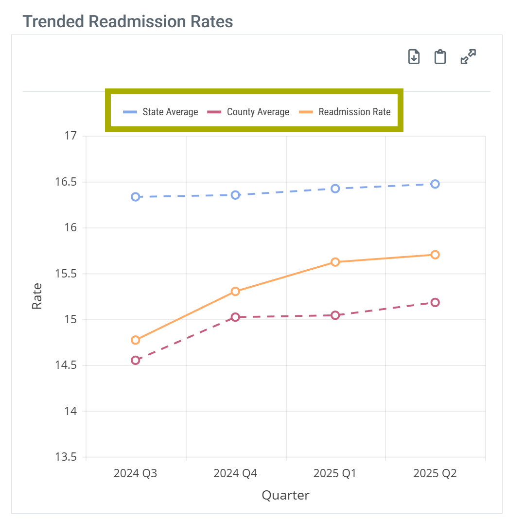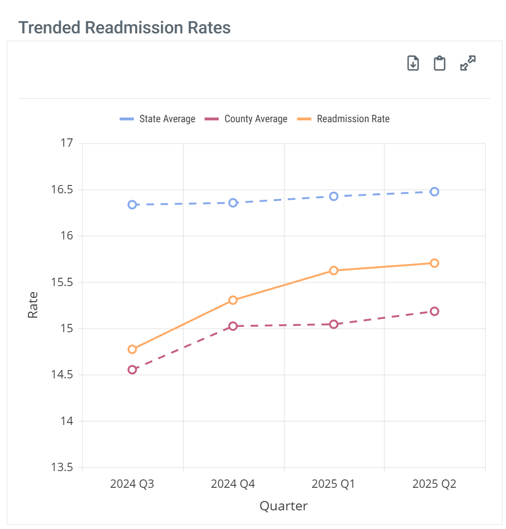 | Trended Readmission Rates - shows the fluctuation of the facility's readmission rate over a 4 quarter period as compared to state and county benchmarks | ![]() |