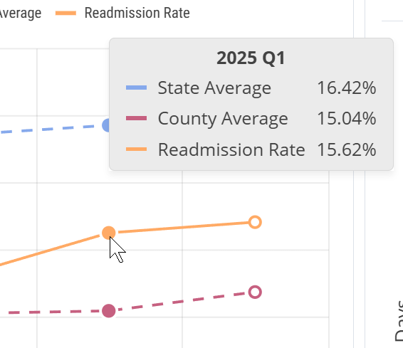 When you hover over a column in the Trended Readmission Rates chart, the metrics for the data points for the trendlines are displayed. (image below) |